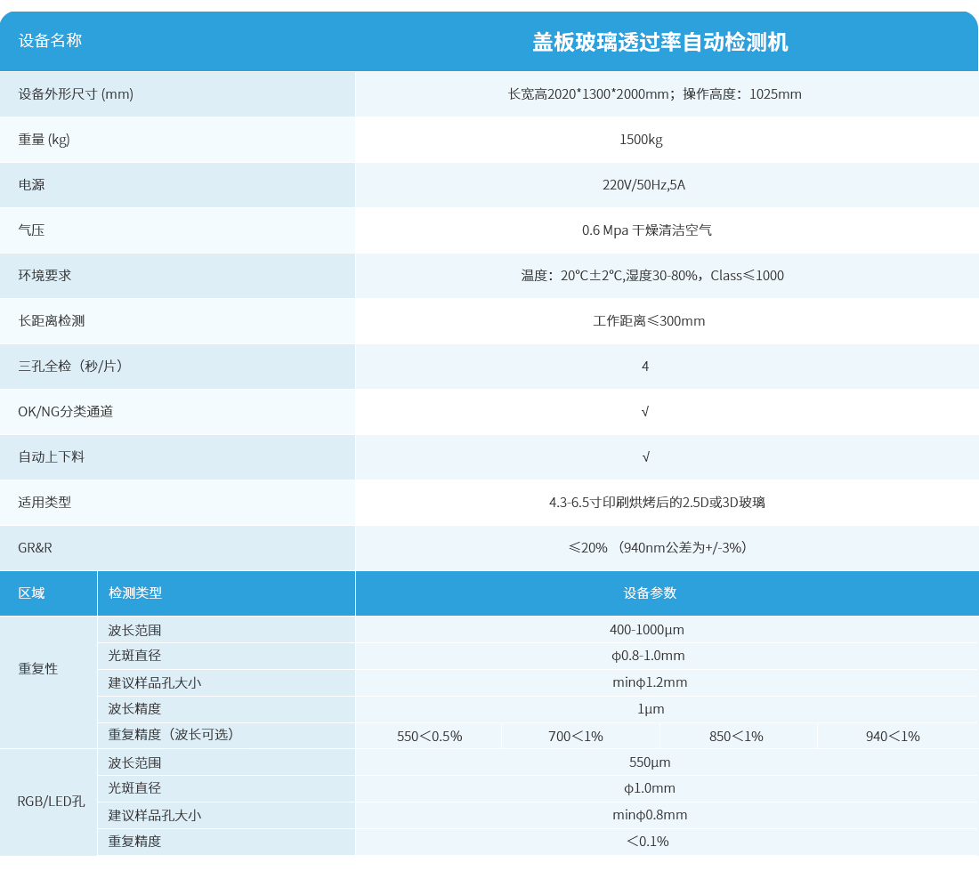 玻色透过率自动检测机解决了市场上盖板玻璃多孔透过率同检的困难以及单台单孔检测的繁琐,以自主研发全波段透过率检测技术实现IR 孔、LED孔、Flash孔三孔同步检测,最长检测距离可达到300mm。检测平台精准定位,量测高效,检测报告自动生成,设备操作方便/灵活,可实现一键换型,满足客户产品生产过程中产品换型的需求。